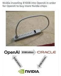Normal organic capital from Venture Capital is not enough. Funding rounds have gotten “creative.” According to OpenAI’s projections, they’ll need massive capital inflows in the coming years. The only player who can invest at that scale right now is Nvidia — maybe Apple or one of the other “Magnificent 7,” which, by the way, represent 36% of the S&P 500’s total value. This has laid the foundation for cross-ownership. The easiest way to explain it is with a meme.
